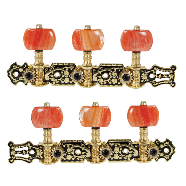 Clavijeros para guitarra. Acabado dorado y detalles negros. Palomillas color naranja nacarado. Tornillos de fijación. Set de 2 unidades. Ejes de plástico de un solo agujero. Placa de acero dorado.