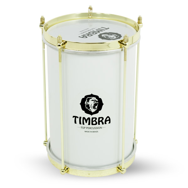 Repeniques / Bacurinha de alumínio pulido. Acabado blanco. Parche blanco P3 de 250 micras. 5 puntos de tensión. Herrajes dorados.Peso: 2,1Kg. Timbra Top Percussion.